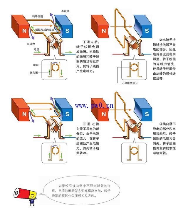 使用了直流电的直流电动机是由永磁铁和转子线圈、换向器、电刷等组成的。