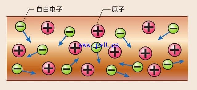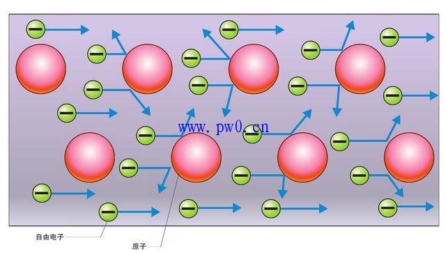 金属的原子并不按序排列,一部分的电子会脱离原子自由运动。此时,给金属加上电压后,自由运动的电子会一同从负极向正极流动。