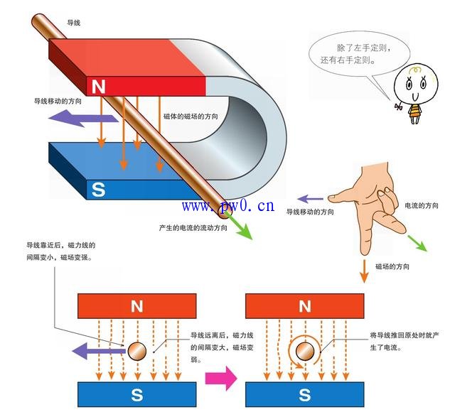 这个导线移动的方向、磁场的方向、电流的流动方向分别和右手的中指、食指、大拇指呈直角相交的方向一致。这被称作“弗莱明的右手定则”。