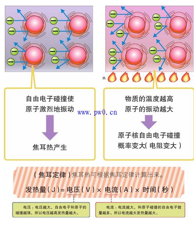 自由电子在流动时受到电阻的阻碍,从而产生焦耳热。