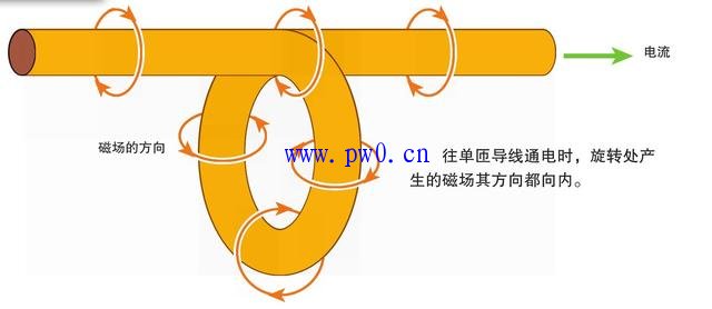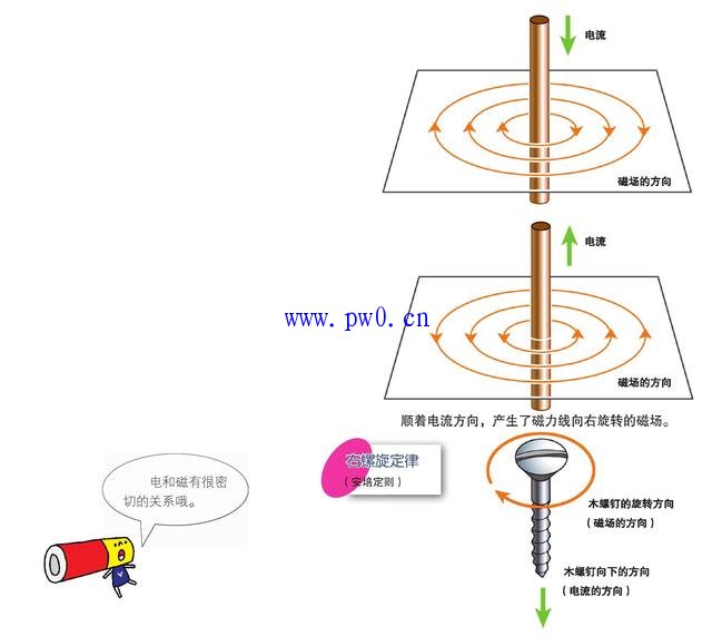 导线通电后,在导线周围会形成圆形的磁场,这称为“磁效应”。顺着电流的方向,产生的磁场的方向都是向右转。就和拧紧木螺钉一样,需要向右旋转木螺钉,这称为“右螺旋定律”。为了纪念发现该现象的人,也被称为“安培定则”。