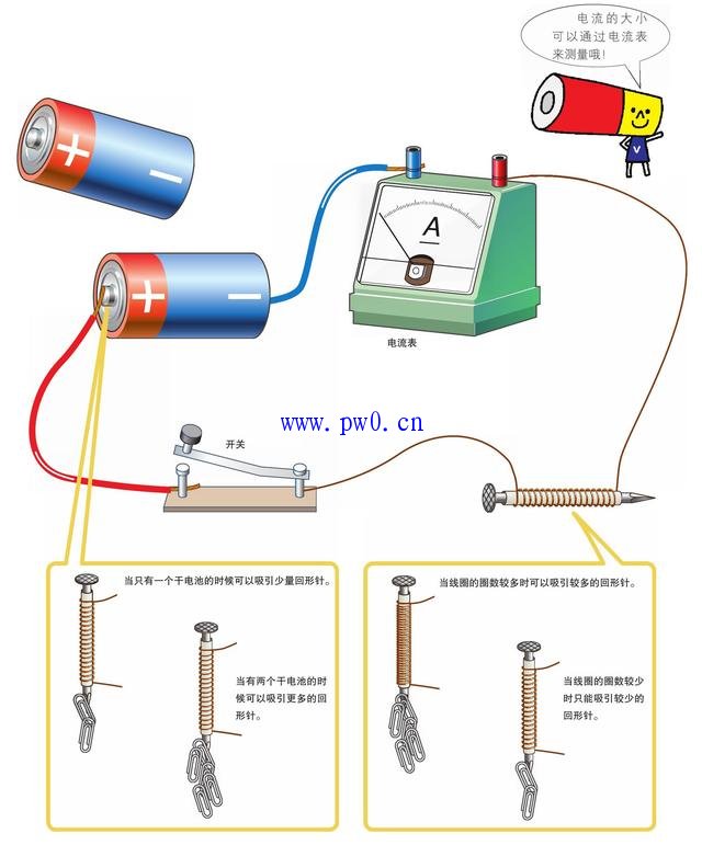 随着电流的变化,电磁铁的磁性也会发生变化。试着把两个干电池串联起来,可以看到,流过电磁铁线圈的电流增加,电磁铁的磁性便会增强。