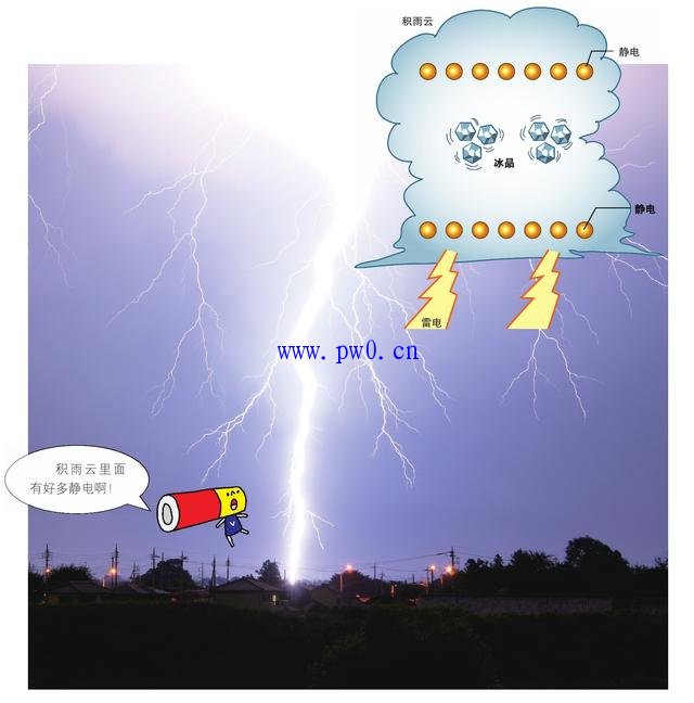 雷电是云里面堆积的静电对外放电的一种现象。积雨云是由大量的冰粒积聚而组成的。在云里面,由于强烈的气流作用,冰粒会互相摩擦,从而产生静电。虽然大气是无法导电的绝缘体,但是大量的静电积聚到一定程度后便会冲破云的绝缘界限导入到大气中。这个过程称之为“放电”。