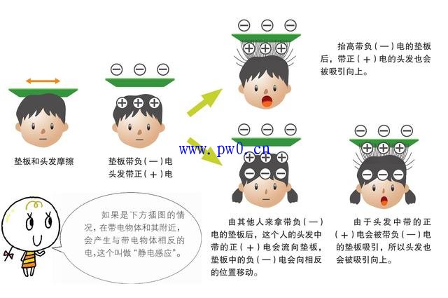 把塑料垫板和头发摩擦一下,就会互相带上静电。头发带正电,垫板带负电。由于正负电会互相吸引,头发会和垫板紧贴在一起。不同静电会相互吸引,同种静电则会相互排斥。这种电荷之间的作用力称之为“库仑力”。