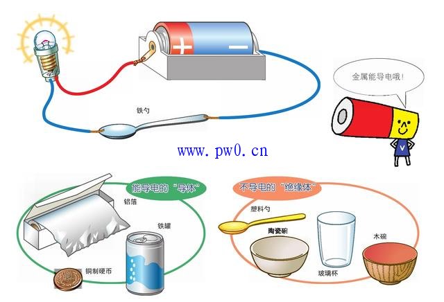 在电路中的导线上连接某个物体,当灯泡亮了的时候,被连接的这个物体中也会有电流通过。当连接的是铁勺、铝箔或铜质的硬币等物体时都可以使灯泡发亮。但是,同样是勺子,塑料勺子却没有这个功能。玻璃杯、木碗、陶瓷碗等也都不行。