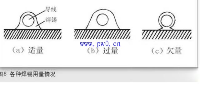 图8(c)则是焊锡量不足的情况。这种情况在焊接初期并不容易看出有什么缺陷,但经过一段时间后,可能会因震动或拨动而脱落。对于有问题的不良焊点,应采取补焊措施,使焊接质量达到满意程度。