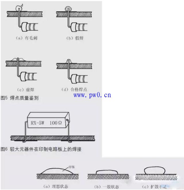 四焊:焊就是把"测"试合格的元器件按要求焊接到印制电路板或指定的位置上去。焊接时一定要掌握好电烙铁的温度与焊接时间,温度过低,时间过短,焊出来的锡面就会像图5(a)那样带有毛刺状尾巴,表面不光滑,甚至呈图5(b)所示的豆腐渣样,有可能由于焊剂没有全部蒸发完,在焊锡与金属之间留有一定的焊剂,冷却后靠焊剂(松香)把焊锡与金属面粘住,稍一用力就能拉开,这就是所谓的假焊。