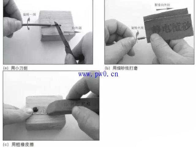 需要说明的是,有些元器件引线已经镀银、金或经过搪锡,只要没有氧化或剥落,就不必再去刮它,如表面有脏物,可按照图3(c)所示用粗橡皮擦除。粗橡皮的选择以绘图用的大橡皮效果最好。有些镀金的晶体三极管管脚引线等,在刮掉镀层后反而会难以镀上锡。无论采取何种形式的"刮",都要注意不断旋转元器件引脚,务求将引脚的四周一圈全部清理干净。