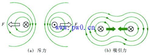 如果有两条通电的直导线相互靠近,会发生什么现象?我们首先假设两条导线的通电电流方向相反,图(a)所示。那么,根据上面的说明,两条导线周围都产生圆形磁场,而且磁场的走向相反。在两条导线之间的位置会是说明情况呢?不难想象,在两条导线之间,磁场方向相同。这就好像在两条导线中间放置了两块磁铁,它们的N极和N极相对,S极和S极相对。由于同性相斥,这两条导线会产生排斥的力量。类似地,如果两条导线通过的电流方向相同,图(b)所示,它们会互相吸引。