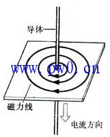 如果一条直的金属导线通过电流,那么在导线周围的空间将产生圆形磁场。导线中流过的电流越大,产生的磁场越强。磁场成圆形,围绕导线周围。磁场的方向可以根据“右手定则”(如图)来确定:将右手拇指伸出,其余四指并拢弯向掌心。这时,拇指的方向为电流方向,而其余四指的方向是磁场的方向。实际上,这种直导线产生的磁场类似于在导线周围放置了一圈N、S极首尾相接的小磁铁的效果。