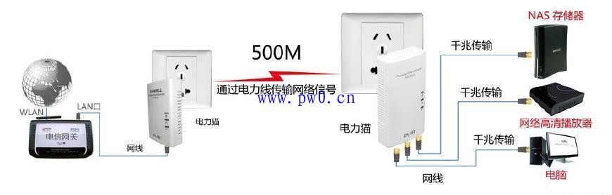 “电力猫”即“电力调制解调器”,是通过电力线进行宽带上网的Modem的俗称。可以将家中的任何一个普通电源插座转换为网络接口,无须另外布网线就可以轻松上网。