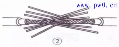 4)先在一端把邻近两股芯线在距叉口中线约3根单股芯线直径宽度处折起,并形成90°
