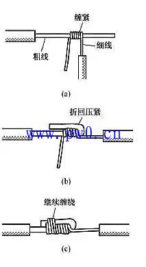 不同截面单股铜导线连接方法如图所示,先将细导线的芯线在粗导线的芯线上紧密缠绕5~6圈,然后将粗导线芯线的线头折回紧压在缠绕层上,再用细导线芯线在其上继续缠绕3~4圈后剪去多余线头即可。
