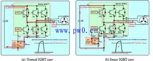 另一方面,SCP侧重于IGBT故障。Fairchild SPM智能功率模块中的IGBT具备卓越的短路性能,但如果不能在几微秒内安全关断,仍可能受损。因此,应配置延迟时间固定在几微妙的硬件,而非通过软件实现。保护IGBT免受短路损坏的最常见方法是通过电流检测电阻感测负直流总线电轨上的电流,如图4(a)所示,并将压降前馈至栅极驱动器,以便后者同时软关断IGBT.在短路条件下关断IGBT可能造成过大电压尖峰和闭锁故障。而软关断是克服这些问题最为有效的方法。对于额定功率高于5 Hp的变频器,电流检测电阻的选择相当有限,而Fairchild的SPM 2系列产品采用感测IGBT,其中配备感测发射极引脚,载流仅为实际发射极电流的一小部分。三个感测发射极相连,使电流通过外部电流检测电阻,如图 4(b)所示。压降以相似的方法前馈至栅极驱动IC。