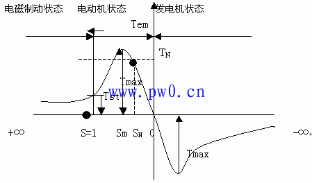 曲线中有两个数值对电机的运行具有特别的重要意义,一个是最大电磁转矩Tmax,一个是起动转矩Tst,这两个转矩是衡量电动机性能好坏的重要指标。再加上额定转矩TN,构成了异步电动机中三个重要转矩。