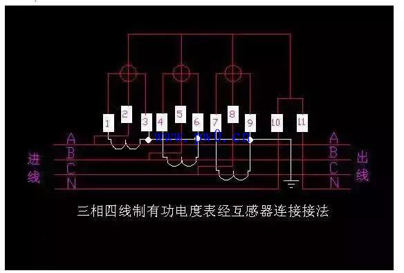 度表测量大电流的三相电路的用电量时,因为线路流过的电流很大,例如300-500A,不可能采用直接接入法,应使用电流互感器进行电流变换,将大的电流变换成小的电流,即电度表能承受的电流,然后再进行计量。