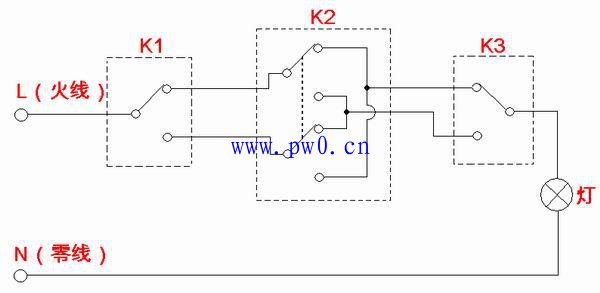 所谓双控开关,是由两个独立的单刀双掷开关组合来实现的,现在市场上几乎每个品牌和系列的开关都有单极和双极的,那个双极的就是我们这里用的。从上面的图上可以看出无论你拨动哪个开关(K1或K2),整个电路的状态都会切换(连通和断开),这就实现了任何一个开关都可以随时打开或关掉所控制的灯,这就是双控。同样,三控开关就是说三个不同地点的开关可以任意地用其中一个随意控制一个灯,它的电路复杂一点,用到了一个双刀双掷开关: