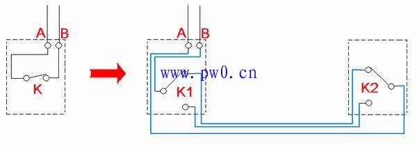 稍微解释一下:图中A、B就是原有线路中的开关线,把原有的单极开关(K)拿掉,换上双极开关(K1),通过走线槽由这个原有的开关盒(K1)过3根线到新的开关盒(K2),图中A、B两根线不必区分,也就是说哪根是A哪根是B无所谓,双极开关中的两个极(K1、K2中垂直方向并排的那两组开关端子)也不必区分。