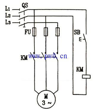 点动控制是指:按下按钮,电动机就得电运转;松开按钮,电动机就失电停转。这种控制方法常用于电动葫芦的起重电机控制和车床拖板箱快速移动的电机控制。点动、单向转动控制线路是用按钮接触器来控制电动机运转的最简单的控制线路接线示意图如下右图所示。
