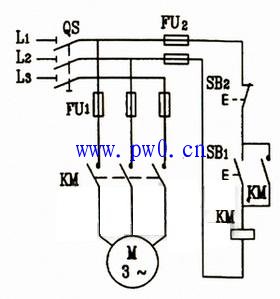 在要求电动机启动能连续运行时,只需要在上图中的控制线路上串接一个停止按钮,在启动按钮的两端并接一个接触器的常开辅助触头即可。如右图所示。线路的工作原理:先闭合电源开关QS: