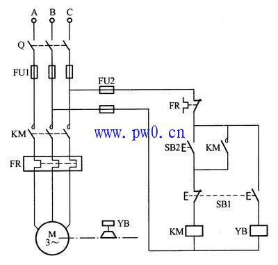 工作原理:合上电源开关Q,按下起动按钮SB2,接触器KM得电吸合并自锁,主触点闭合,电动机带动机械运行。这时电磁抱闸的电磁线圈YB无电,抱闸被打开,电动机正常运行。