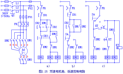 功率较小的双速电动机可采用图a)和图b)的控制方式;容量较大的双速电动机,宜可采用图c)的控制方式。