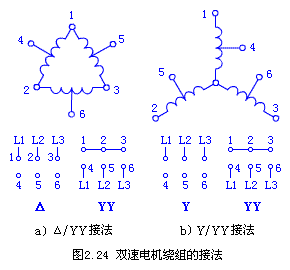 1.Δ/YY接法 图2.24a)为双速电动机Δ/YY接法电路图。当绕组的1、2、3号出线端接电源,而使4、5、6号出线端悬空时,电机绕组接成三角形,每相绕组中有两个线圈串联,成四个极,电动机低速运转;当把1、2、3号端子短接,4、5、6号端子接电源时,则绕组为双星形,每相绕组中两个线圈并联,成两个极,电机作高速运转。