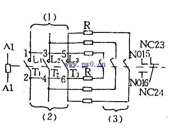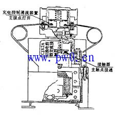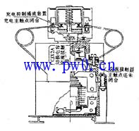 充电抑制涌流装置:由充电主触头、辅助触头和限流电阻组组成。充电主触头支架和辅助触头支架是由永久磁铁联结(吸合)。有时吸合,有时分开。(见图2),辅助触头支架又和接触器支架相联结。接触器触头动作该辅助触头也动作。辅助触点有二对。
