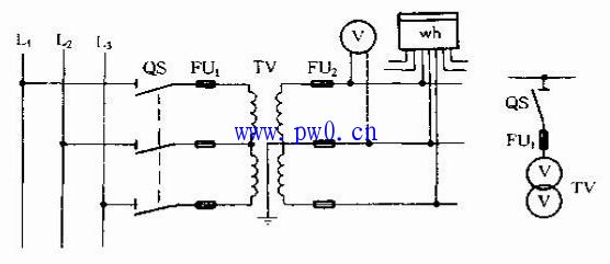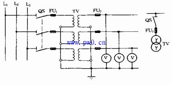 在三相线路中,这种接线只能测量某两相之间的线电压,它用于连接电压表、频率表及电压继电器等.如圈1所示。