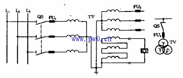 在供电系统正常运行时,开口三角形两端的电压近似等于零,当系统发生一相接地时,开口三角形两端出现零序电压,使电压继电器Kv吸合。发出报警信号。