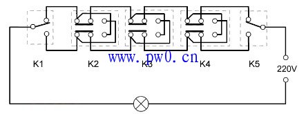 五孔开关接线我们先来看看下面这张图,不难看出,只要增加中间双刀双掷开关的数量,就可以实现多地点控制一盏灯(理论上可以是无限数量),四控、五控、六控……,想增加多少都可以。