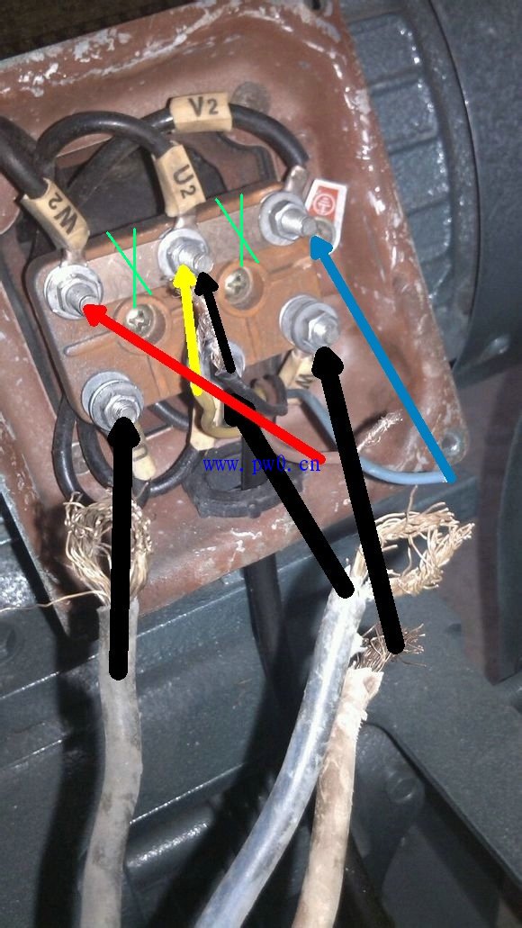 电动机星形连接的铜片去掉,粗的3根电源线接下面3个接线端子,细的黄色、黑色接上面中间接线端子,红、兰分别接在上面 左右两接线端子上,按箭头接,最后还要看看你的按钮开关(双刀双掷)也要按图接。 你先把3根电源线其中1根线直接接在U1柱上面,然后打开手握开关盖,找出开关一头上的2根线,并且记住它们的颜色,从开关把的另一头把这2根线分别接在V1,W1的2个柱上面,然后把开关另一头上面的2根线分别和另2根电源线接在一起就OK了,