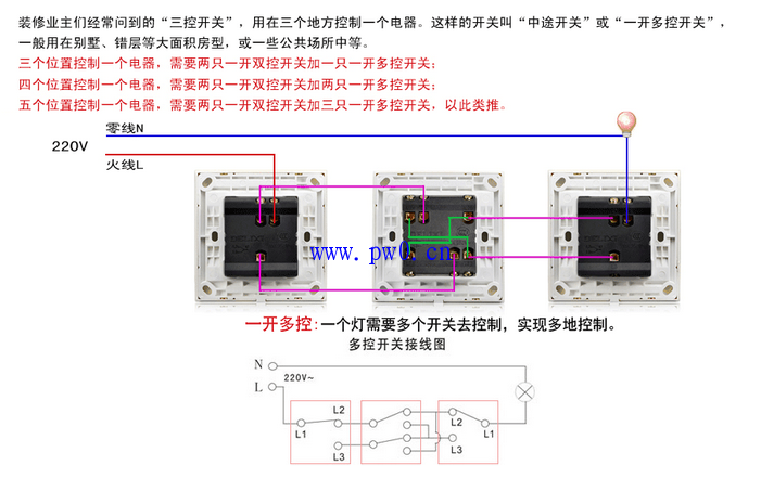 多控是三个开关在三个位置控制一个灯,一般家庭不需要多控开关。一开多控开关背后有6个接线柱。(注:多控开关需要3个一组购买,接线才有用。如果不是三个多控一组,多控线路最少需要:2个双控开关,1个多控开关。)