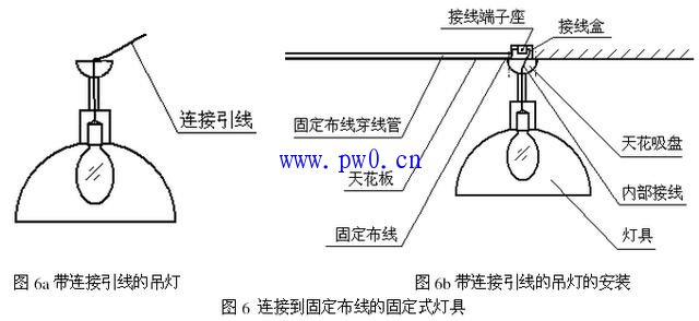 图6a是一个带连接引线的吊灯,该引线从灯具灯座的接线端子直接引出,没有提供电源接线端子。如果该连接引线要通过一个独立的接线端子座与固定布线连接,灯具的安装说明书应说明该灯具电源接线端子的安排,如安排在灯具内还是灯具外、接线端子座的尺寸、接线盒的尺寸等。