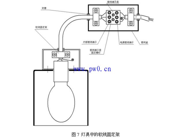 软线固定架的应用示例见图7。图7中的接线盒和灯具灯腔之间的接线属于接线伸出灯具外超过80mm,而且可能受到应力的例子,这部分接线应符合外部接线的规定,即接线的导体截面积不小于0.75mm2(对普通灯具),而且应在接线两端进入接线端子前使用软线固定架以消除应力。