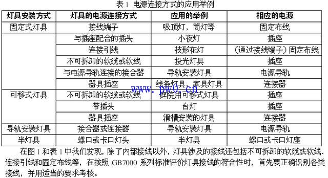灯具的种类繁多,一般来说,安装方式决定了灯具的电源连接方式,而灯具提供的电源连接方式也决定了所需的电源形式,表1给出了各类灯具常用的电源连接方式。