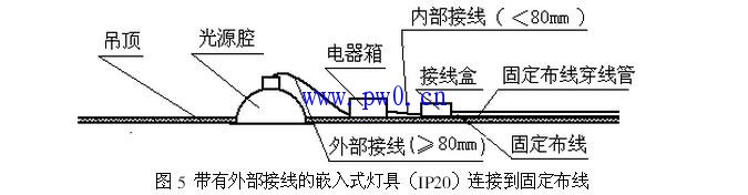 以图5给出的一个嵌入式筒灯为例,该灯具由光源腔、电器箱和接线盒等几个部件组成,各个部件之间用软缆连接,然后通过接线盒中的电源接线端子连接到固定布线。要注意的是图5中连接几个部件的软缆,这些软缆均用于灯具部件之间的连接,所以容易误认为这些都是内部接线,根据上述5.3.5的规定,应按下述情况考虑接线的性质及其要求:
