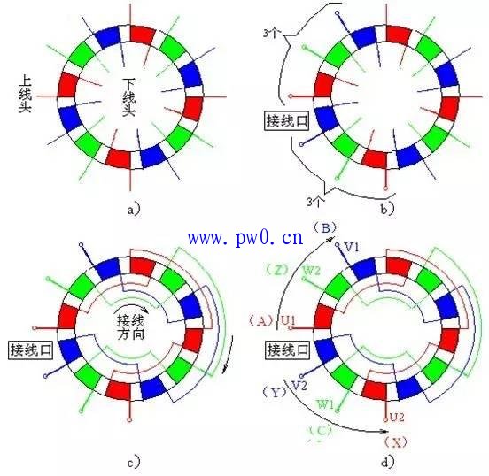 (2)同一相的各极相组之间,应该是下层边与下层边相接,上层边与上层边相接。剩下的三个头,就是相尾了。