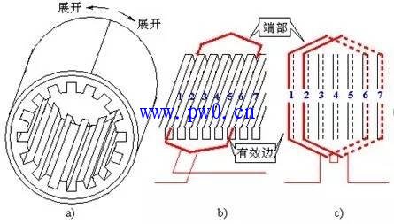 a)三相绕组特点 b)分布绕组 c)双层绕组的铁心