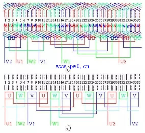a)三相绕组接线全图 b)极相组接线图