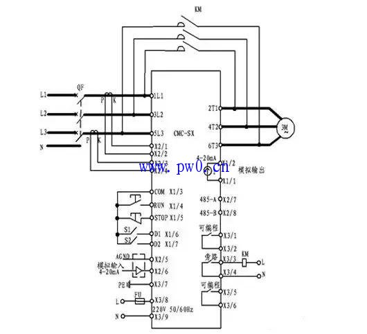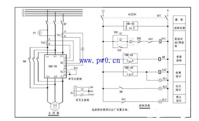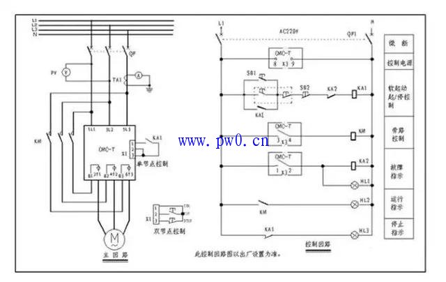 1.上图所示为单节点控制方式。接点闭合软起动起动,接点打开软起动器停止。但要注意这种接线LCD面板起动操作无效。端子3、4、5起停信号是一个无源节点。