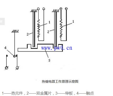 利用两种膨胀系数不同的金属(通常为锰镍和铜板)辗压制成的双金属片受热弯曲去推动扛杆,从而带触头动作。
