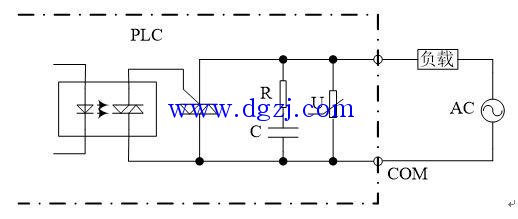 晶闸管输出接口驱动电路采用光触发型双向晶闸管进行隔离和驱动放大,并联在双向晶闸管两端的RC吸收电路和压敏电阻用来抑制晶闸管关断过电压和外部的浪涌电压。这种接口电路只能接交流负载信号,带负载能力一般为每输出点1A左右,不同型号所加交流负载电压和带负载能力有所不同。