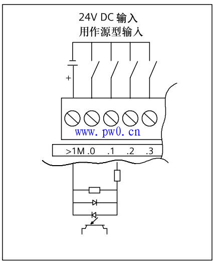 源型输入:电流从PLC内部流出经外部开关至电源负极,1M端接电源正极。