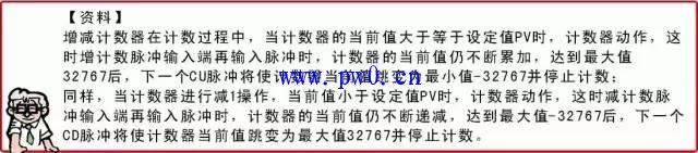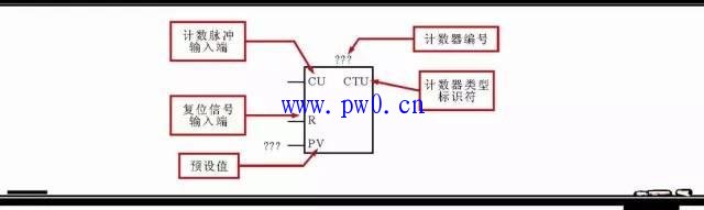 ①增计数器(CTU)的标注。增计数器(CTU)是指在计数过程中,当计数端输入一个脉冲式时,当前值加1,当脉冲数累加到等于或大于计数器的预设值时,计数器相应触点动作(常开触点闭合,常闭触点断开)。