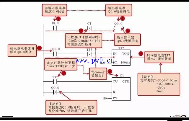 可以看到,该程序中,初始状态下,输出继电器Q0.0的常闭触点闭合,即计数器复位端为1,计数器不工作;当PLC外部输入开关信号使输入继电器I0.0闭合后,输出继电器Q0.0线圈得电,其常闭触点Q0.0断开,计数器复位端信号为0,计数器开始工作;同时输出继电器Q0.0的常开触点闭合,定时器T37得电。