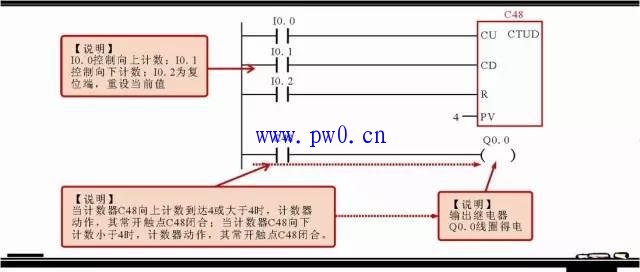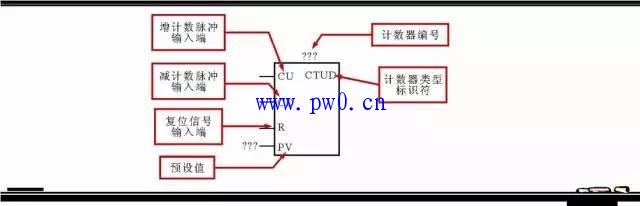 ③增减计数器(CTUD)的标注。增减计数器(CTUD)有两个脉冲信号输入端,其在计数过程中,可进行计数加1,也可进行计数减1。