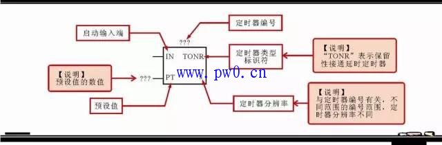 ②保留性接通延时定时器(TONR)的标注。保留性接通延时定时器(TONR)与上述的接通延时定时器(TON)原理基本相同,不同之处在于在计时时间段内,未达到预设值前,定时器断电后,可保持当前计时值,当定时器得电后,从保留值的基础上再进行计时,可多间隔累加计时,当到达预设值时,其触点相应动作(常开触点闭合,常闭触点断开)。