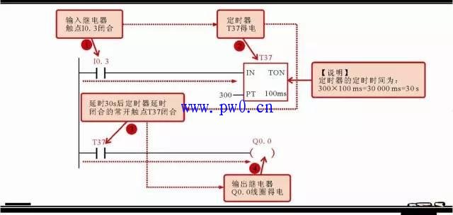 可以计算出,该定时器的定时时间为300×100ms=30000ms=30s;则在该程序中,当输入继电器I0.3闭合后,定时器T37得电,延时30s后控制输出继电器Q0.0的延时闭合的常开触点T37闭合,使输出继电器Q0.0线圈得电。