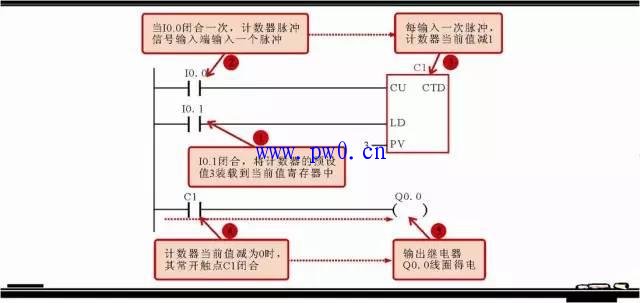 在西门子PLC梯形图中,计数器的结构和使用与定时器基本相似,也是应用广泛的一种编程元件,用来累计输入脉冲的次数,经常用来对产品进行计数。用“字母C+数字”进行标识,数字从0~255,共256个。